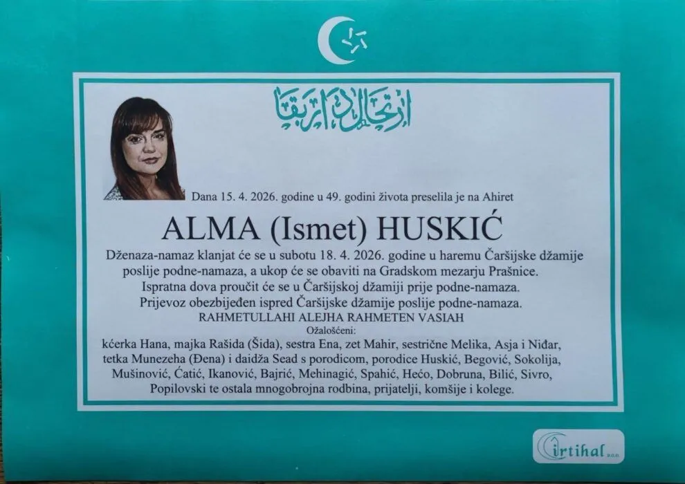 Dugogodišnja novinarka preminula je 15. aprila 2026. godine u 49. godini života. Alma je bila prepoznatljivo lice lokalnog novinarstva, osoba koja je kroz svoj rad ostavila značajan trag u informisanju građana Zenice i šire.