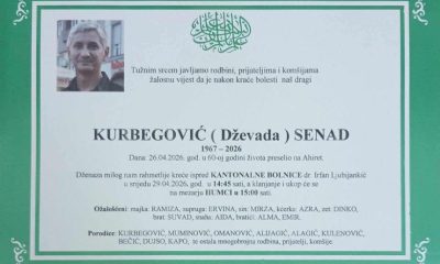 Tužnim srcem javljamo rodbini, prijateljima i komšijama žalosnu vijest da je nakon kraće bolesti naš dragi KURBEGOVIĆ (Dževada) SENAD 1967-2026 Dana: 26.04.2026. god. u 60-oj godini...