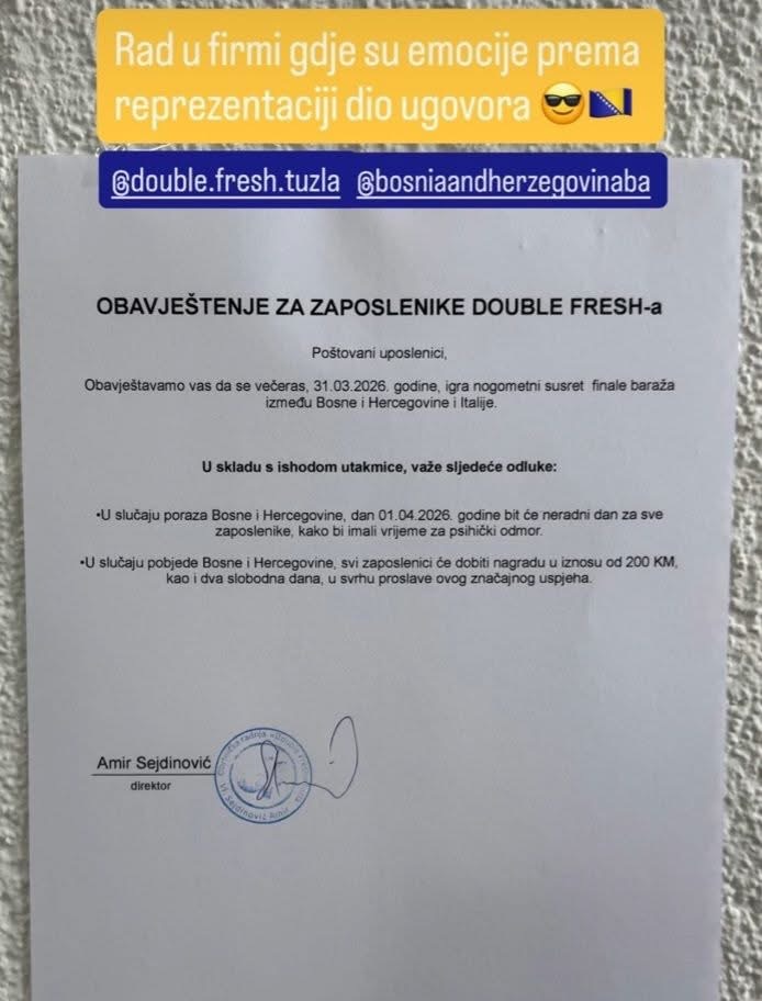 Prema zvaničnom internom obavještenju koje je ubrzo dospjelo u javnost, u slučaju poraza reprezentacije Bosne i Hercegovine, svi zaposlenici dobit će slobodan dan kako bi, kako je navedeno, imali vremena za psihički odmor nakon eventualnog razočaranja.