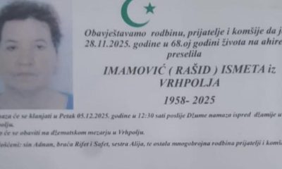 Obavještavamo rodbinu, prijatelje i komšije da je 28.11.2025. godine u 68. oj godini života na ahiret preselila IMAMOVIĆ (RAŠID) ISMETA iz VRHPOLJA 1958 – 2025 Dženaza će se klanjati u petak 05.12.2025. godine...