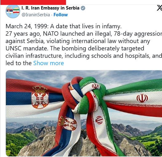 IRANSKA ambasada u Srbiji objavila je poruku povodom godišnjice NATO-ova bombardiranja SR Jugoslavije 1999. godine, usporedivši tu intervenciju s aktualnim ratom Sjedinjenih Država i Izraela protiv Irana.