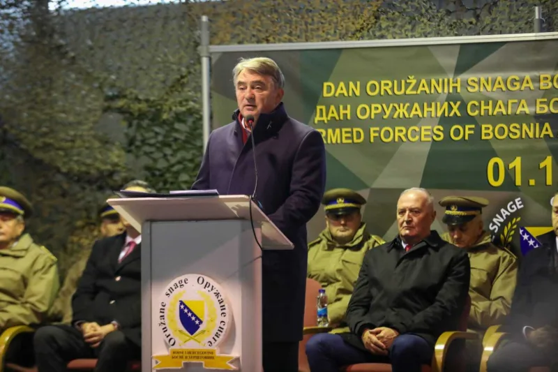 Kao neko ko je govorio na ovom istom mjestu na prvoj godišnjici OS BiH, zadovoljstvo mi je da, u ime Predsjedništva Bosne i Hercegovine kao vrhovnog zapovjednika, i u lično ime, mogu govoriti na obilježavanju i ove jubilarne 20. godišnjice od formiranja Oružanih snaga BiH.