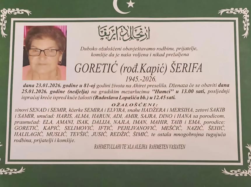 Duboko ožalošćeni obavještavamo rodbinu, prijatelje, komšije da je naša voljena i nikad prežaljena Goretić (rod.Kapić) Šerifa dana 23.01.2026. godine u 81-oj godini života na Ahiret preselila.