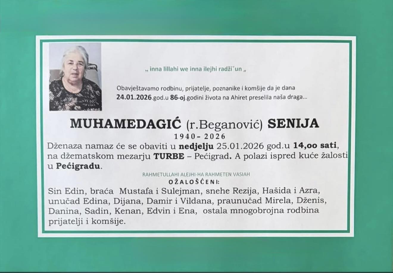 Na bolji svijet preselila je Muhamedagić (rođ. Beganović) Senija, dana 24.01.2026. godine u 86. godini života.