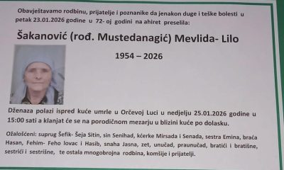 Dženaza polazi ispred kuće umrle u Orčevoj Luci u nedjelju 25.01.2026. godine u 15:00 sati, a klanjat će se na porodičnom mezarju u blizini kuće po dolasku.