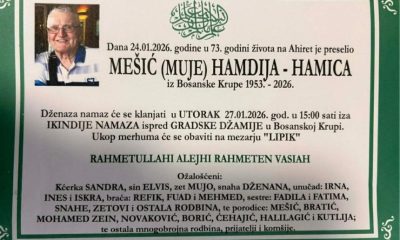 Dženaza-namaz će se klanjati u utorak, 27.01.2026. godine, u 15:00 sati, iza ikindije-namaza, ispred Gradske džamije u Bosanskoj Krupi.