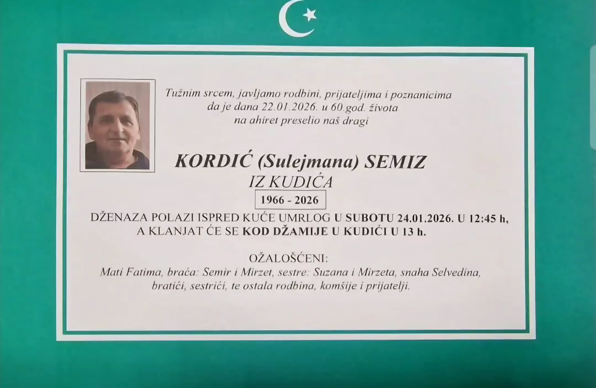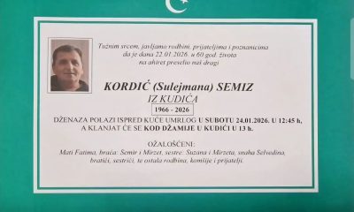 Obavještavamo rodbinu i prijatelje da je 22. januara na Ahiret u 60. godini života preselio Kordić (Sulejmana) Semiz iz Kudića.