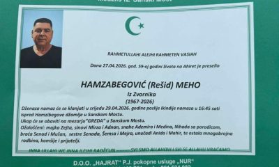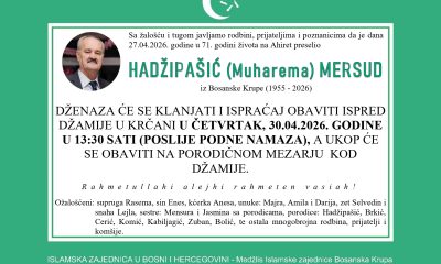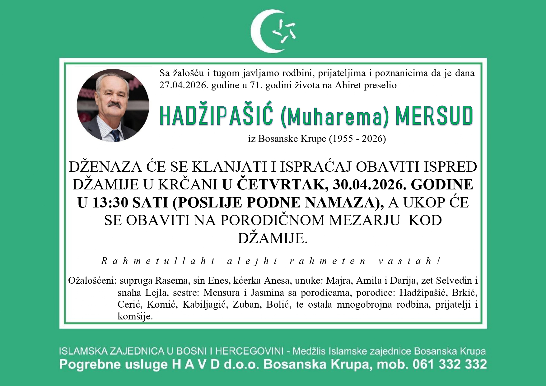 Dženaza namaz će se klanjati u srijedu 29.04.2026. godine poslije ikindije namaza u 16:45 sati ispred Hamzibegove džamije u Sanskom Mostu.