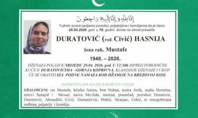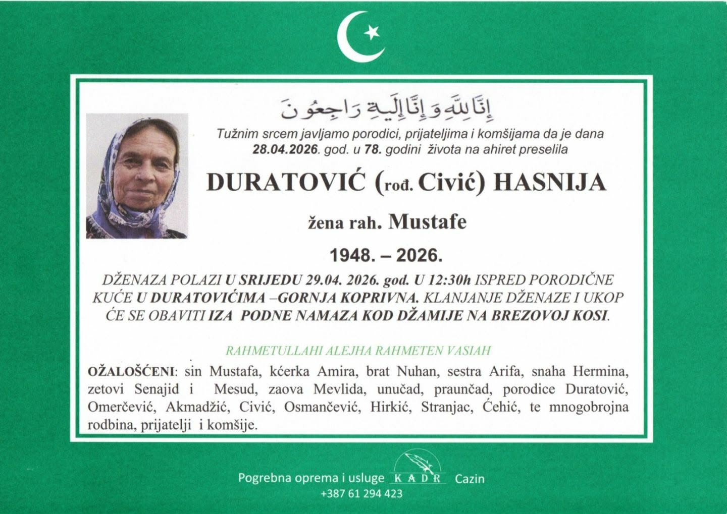Dženaza polazi u srijedu, 29.04.2026. godine u 12:30 sati ispred kuće u Duratovićima – Gornja Koprivna, klanjanje dženaze i ukop će se obaviti iza podne namaza kod džamije na Brezovoj Kosi.