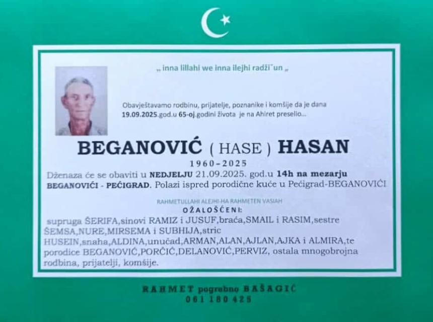 Dženaza će se obaviti u NEDJELJU 21.09.2025. god. u 14h na mezarju BEGANOVIĆI – PEĆIGRAD.