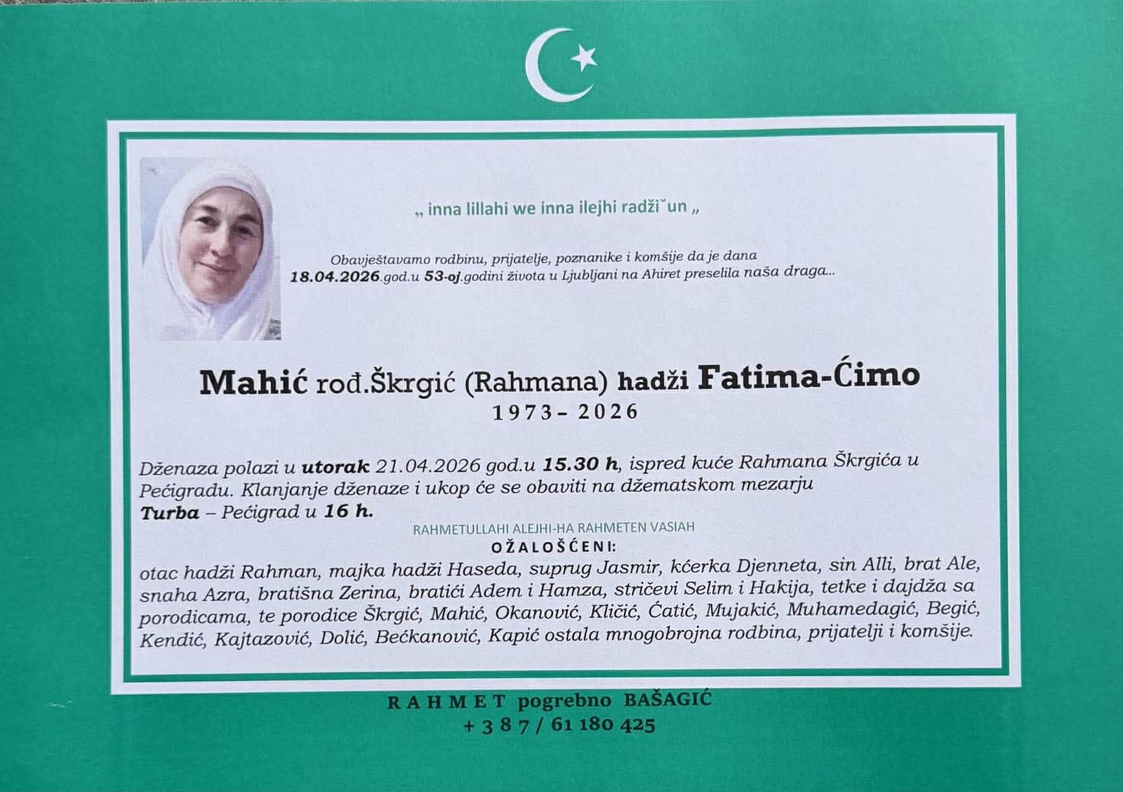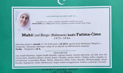 Obavještavamo rodbinu, prijatelje i komšije da je u 53 godini života na ahiret preselila Mahić rođ. Škrgić (Rahmana) hadži Fatima – Ćimo