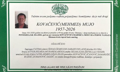 Dženaza i ukop merhuma će se obaviti u ponedjeljak, 20.04.2026. godine na porodičnom mezarju Kovačevići – Mahmića Most iza podne-namaza. Dženaza kreće ispred kuće umrlog.