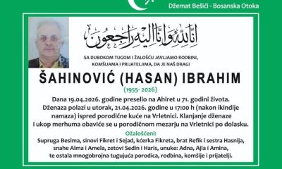 Dženaza polazi ispred kuće Rahmana Škrgića Pećigrad u utorak u 21. 04. 2026. u 15.30 h, a klanjanje dženaze i ukop će se obaviti na mezarju Turba-Pećigrad u 16 h.