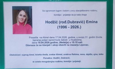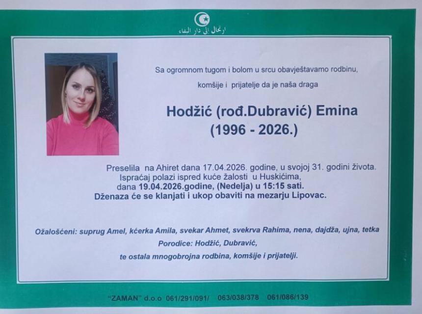 Dženaza-namaz i posljednji ispraćaj Emine Hodžić obavit će se u nedjelju, 19. aprila 2026. godine. Ispraćaj polazi ispred kuće žalosti u Huskićima u 15:15 sati, dok će se ukop obaviti na mezarju Lipovac.