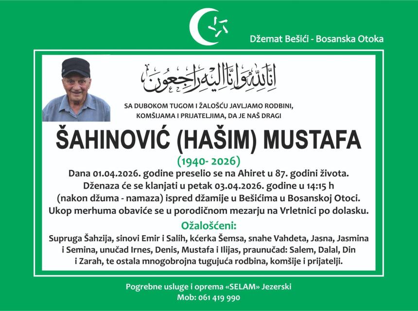 Dženaza će se klanjati u petak 03.04.2026. godine u 14:15 h (nakon džuma – namaza) ispred džamije u Bešićima u Bosanskoj Otoci.