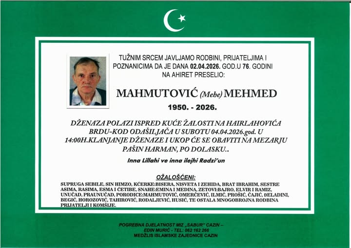 Tužnim srcem javljamo rodbini, prijateljima i komšijama da je naš dragi Mahmutović (Mehe) Mehmed dana 02.04.2026.godine na ahiret preselio u 76-toj godini života.