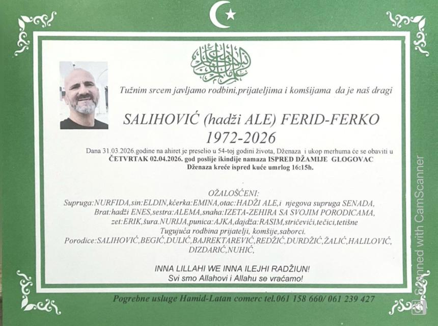 Dženaza i ukop merhuma će se obaviti u ČETVRTAK 02.04.2026. god poslije ikindije namaza ISPRED DŽAMIJE GLOGOVAC.