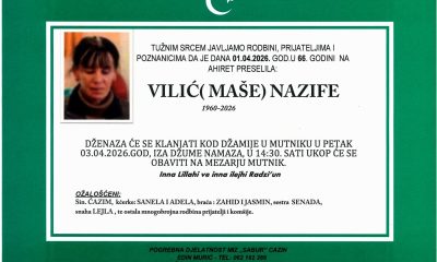 Dženaza će se klanjati kod džamije u Mutniku u petak 03.04.2026 godine u 14:30 sati, a ukop će se obaviti na mezarju Mutnik.