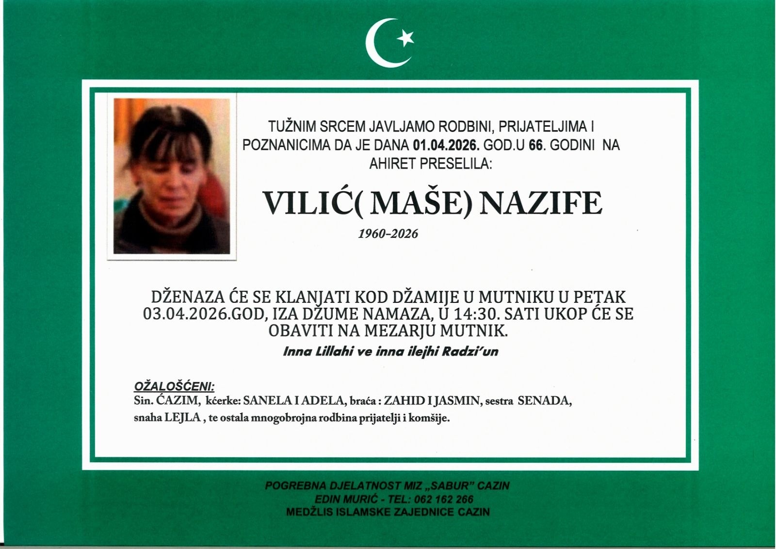 Obavještavamo rodbinu, prijatelje i poznanike da je 01.04.2026 godine u 66. godini na ahiret preselila Vilić (Maše) Nazife.