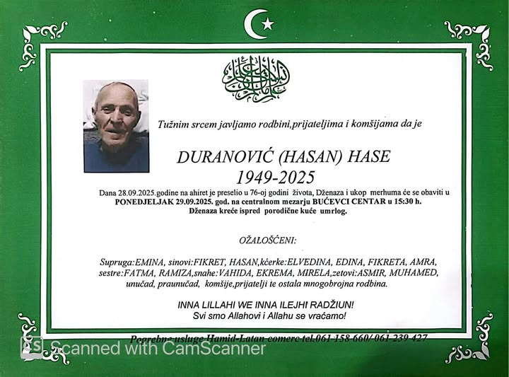 Tužnim srcem javljamo rodbini, prijateljima i komšijama da je Duranović (Hasan) Hase dana 28.09.2025. godine na ahiret je preselio u 76-oj godini života.