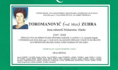 Dženaza polazi ispred kuće Rahmana Škrgića Pećigrad u utorak u 21. 04. 2026. u 15.30 h, a klanjanje dženaze i ukop će se obaviti na mezarju Turba-Pećigrad u 16 h.
