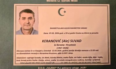 Dženaza polazi u PETAK 16.05.2025.god. u 15:30 h ispred kuće žalosti u Ćoralićima kod Mlina. Klanjanje i ukop dženaze će se obaviti na mezarju “RIBIĆA NJIVE” po dolasku.