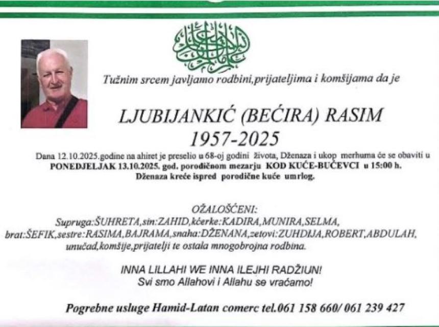 Tužnim srcem javljamo rodbini, prijateljima i komšijama da je Ljubijankić (Bećira) Rasim dana 12.10.2025. godine na ahiret je preselio u 68-oj godini života.