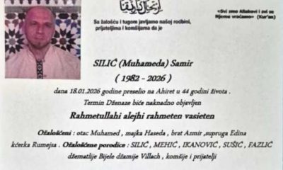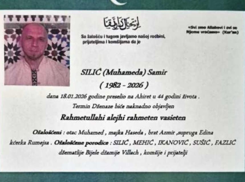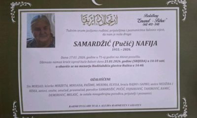 Dženaza namaz kreće ispred kuće žalosti dana 21.01.2026. godine (SRIJEDA) u 14:10 sati, a obavit će se na mezarju Hadžibadića glavica – Ružica u 14:40.