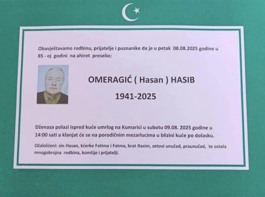 Dženaza polazi u subotu, 09. augusta ispred kuće umrlog na Kumarici u 14.00h, a kanjaće se na porodičnim mezarlucima u blizini kuće po dolasku.