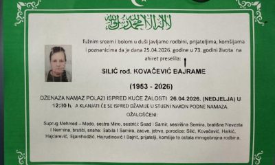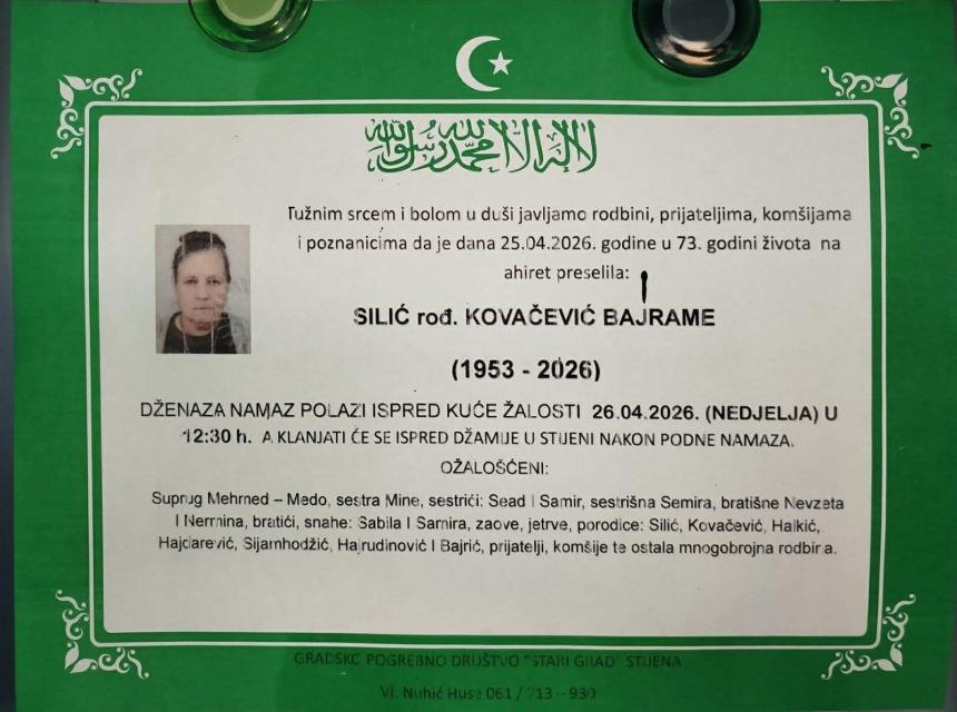 Tužnim srcem i bolom u duši javljamo rodbini, prijateljima i komšijama da je naša draga Silić rođ. Kovačević Bajrame, dana 25.04.2026. godine u 73-oj godini života, preselila na Ahiret.