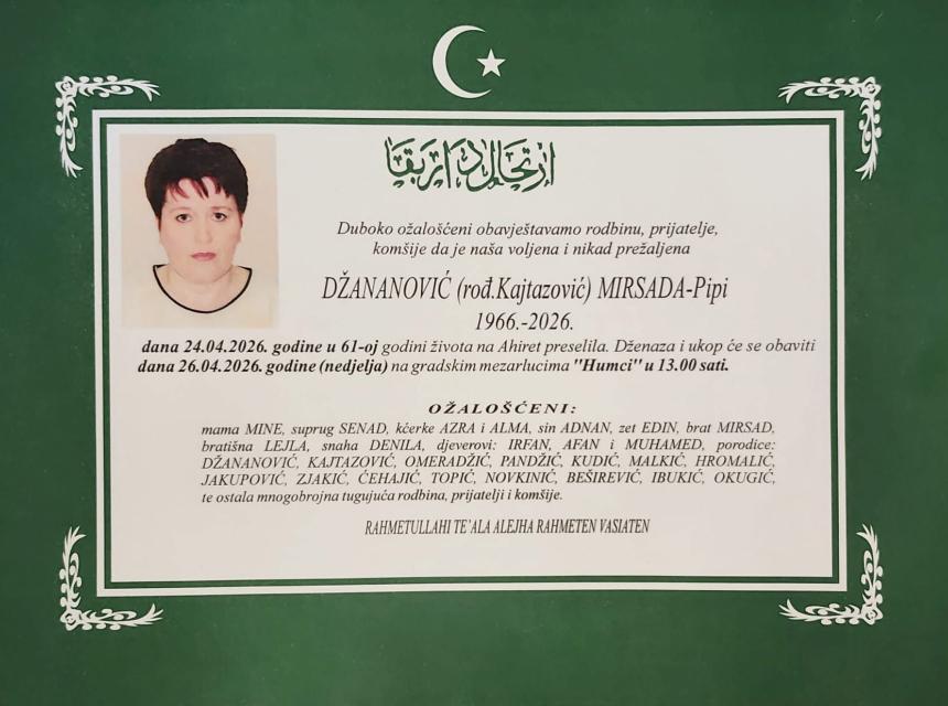 Dženaza i ukop će se obaviti dana 26.04.2026. godine (nedjelja) na gradskim mezarlucima “Humci” u 13.00 sati.