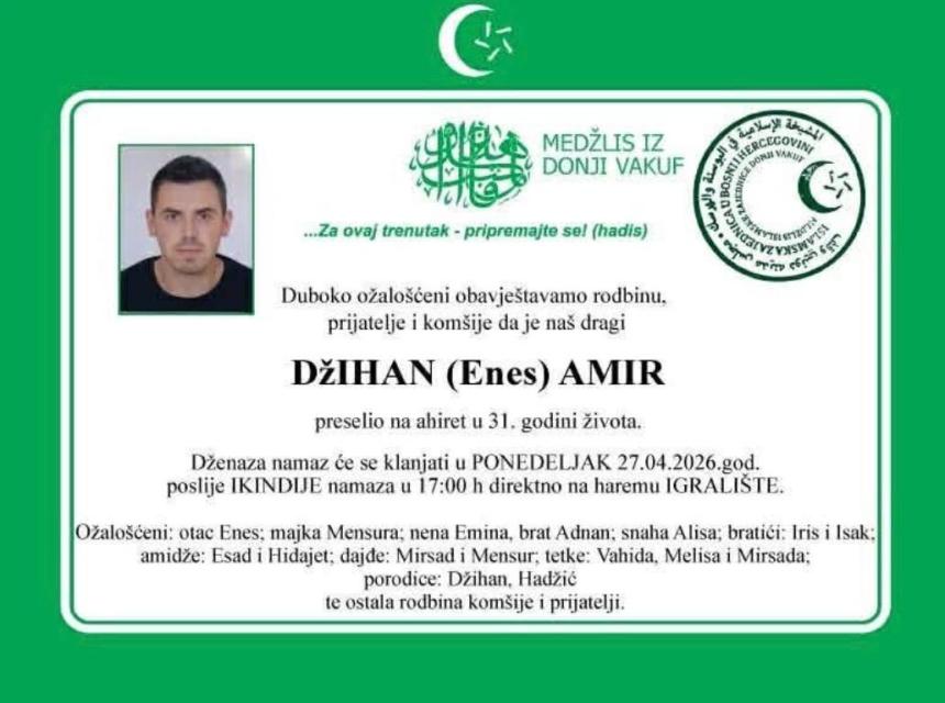 Tužnim srcem i bolom u duši javljamo rodbini, prijateljima i komšijama da je naš dragi Džihan (Enes) Amir, u 31-oj godini života, preselio na Ahiret.