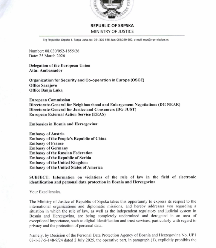 Prije toga, treba reći da se Selak se u svom pismu od 25.marta poziva na presudu Suda BiH iz 2025. godine predstavljajući je kao navodni dokaz da državna Agencija za identifikacione dokumente, evidenciju i razmjenu podataka (IDDEEA ) djeluje’ nezakonito, da nema pravni osnov za dodjelu elektronskog potpisa i da se lični podaci građana obrađuju mimo zakona’