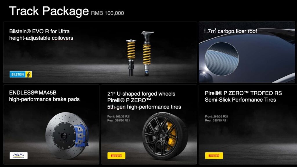 Konačno, u sklopu ovog paketa je Track paket koji obuhvaća Bilstein komponente, karbonski krov te 21-inčne naplatke s Pirelli Trofeo RS pneumaticima. Plan je plasirati na tržište točno 100 primjeraka, i to po beskompromisnoj cijeni manjoj od 100.000 eura.